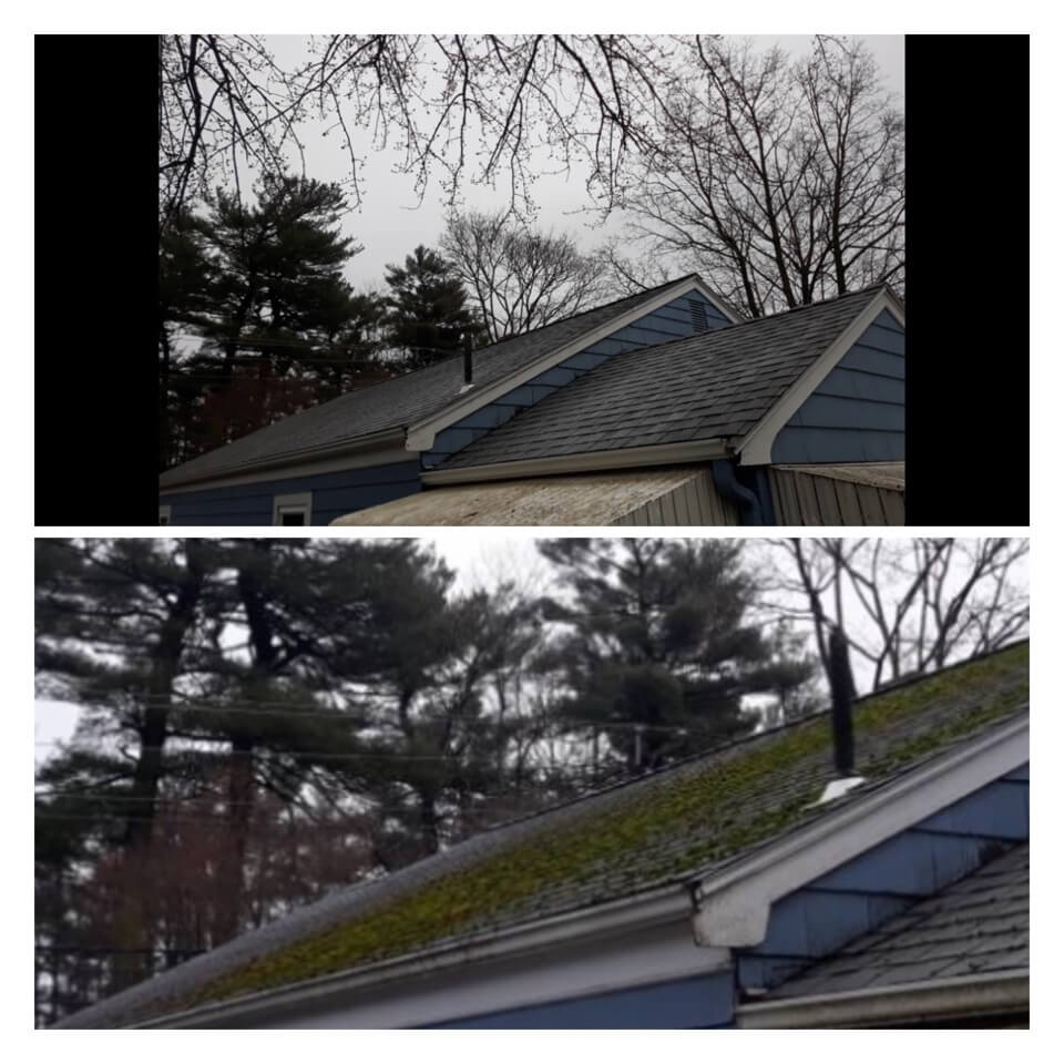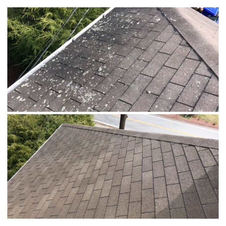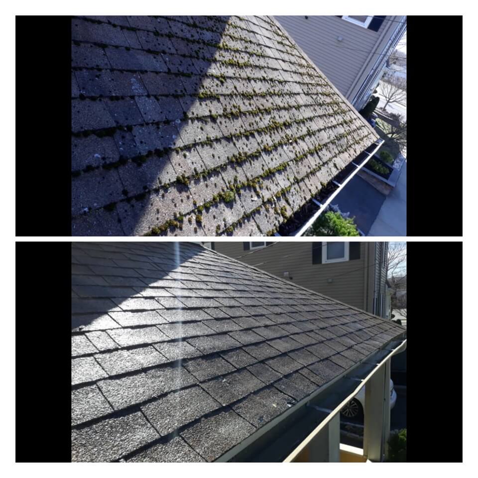 HiCleaners is the most experienced company in Amesbury, MA that deals with roof washing and roof soft washing. All of our employees are trained to recognize precise solution mixing ratios to provide you with the safest and most effective soft washing service. Roofs are a commonly neglected part of a house due to the fact that most people don’t have ladders to access it, so it is very easy to just leave it alone and forget about problems that may start to arise. Just like many home owners, discoloration and small bits of moss on a roof can be overlooked because of the misconception that it is just aesthetic. However, it isn’t just aesthetic, the moss slowly lifts the granules off the shingles which in turn shorten the life of the shingle. The moss also spreads, just like any bacteria if it is left alone for too long, it can quickly become a problem that spirals out of control. Call HiCleaners for a free quote, we only use the most advanced eco-friendly solutions and equipment to make sure the job is done right, for the safety of the employees, your plants, grass, pets, and children.