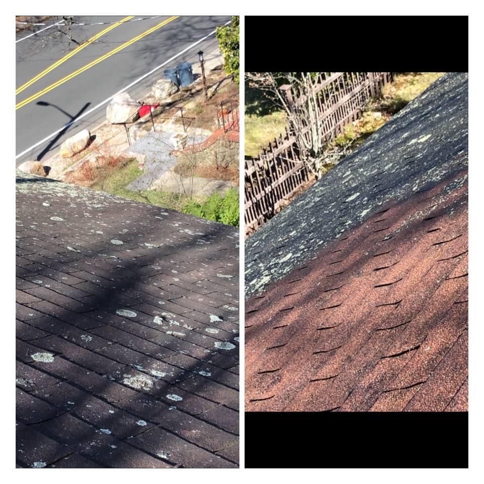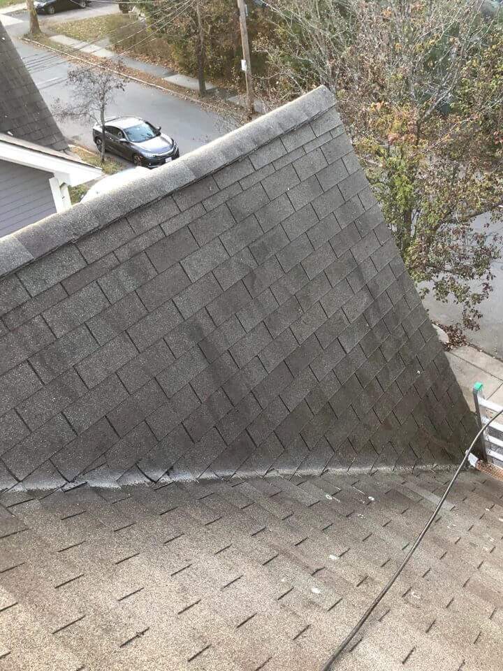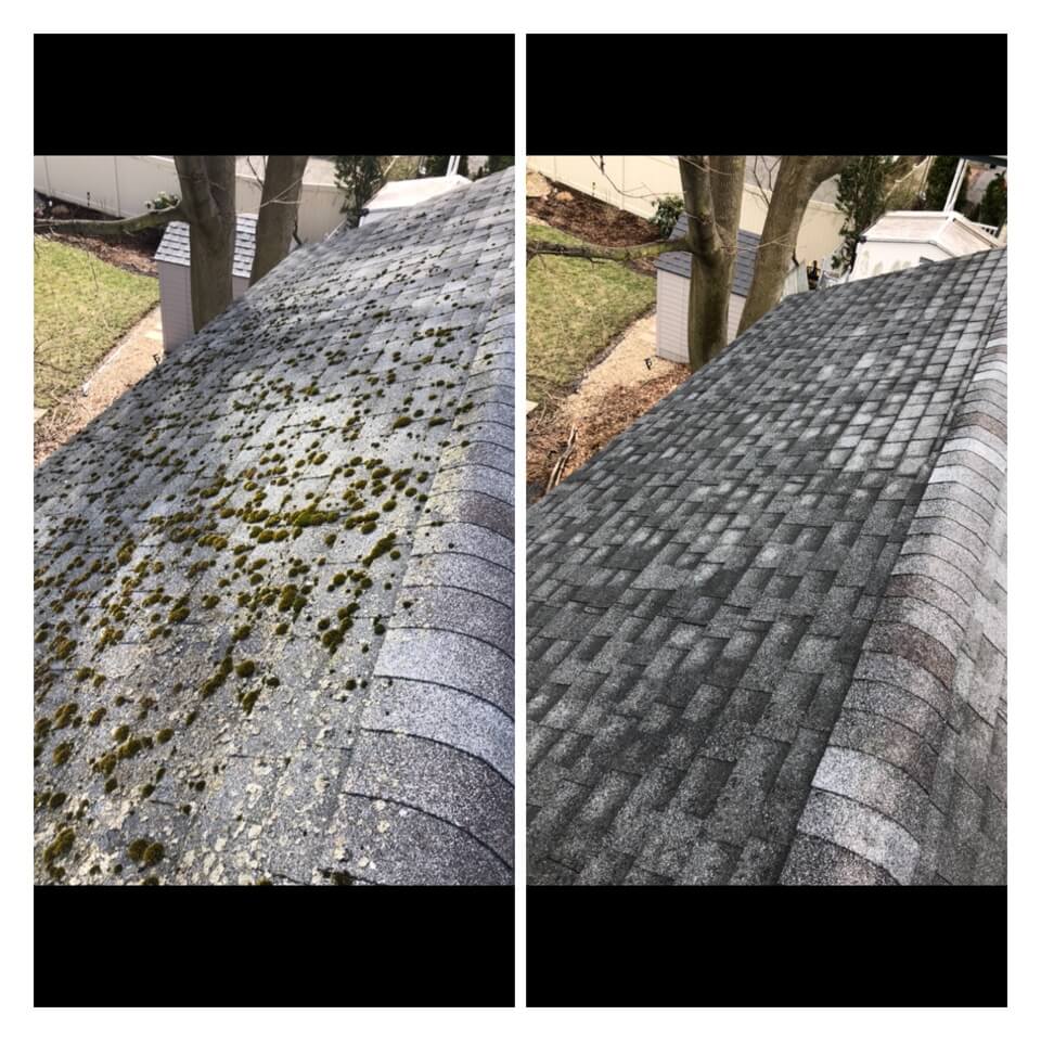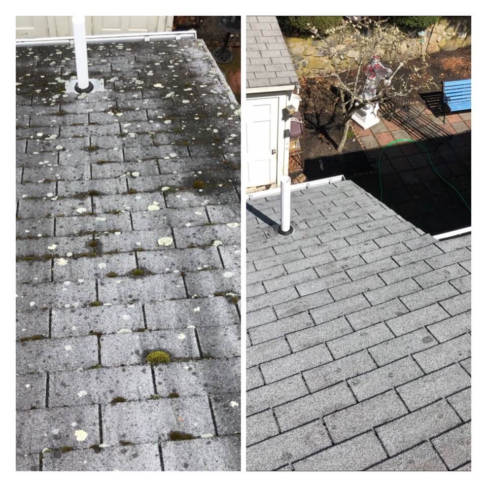 HiCleaners is the most experienced company in Amesbury, MA that deals with roof washing and roof soft washing. All of our employees are trained to recognize precise solution mixing ratios to provide you with the safest and most effective soft washing service. Roofs are a commonly neglected part of a house due to the fact that most people don’t have ladders to access it, so it is very easy to just leave it alone and forget about problems that may start to arise. Just like many home owners, discoloration and small bits of moss on a roof can be overlooked because of the misconception that it is just aesthetic. However, it isn’t just aesthetic, the moss slowly lifts the granules off the shingles which in turn shorten the life of the shingle. The moss also spreads, just like any bacteria if it is left alone for too long, it can quickly become a problem that spirals out of control. Call HiCleaners for a free quote, we only use the most advanced eco-friendly solutions and equipment to make sure the job is done right, for the safety of the employees, your plants, grass, pets, and children.